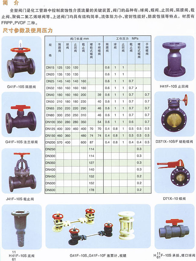 PP隔膜閥、球閥、底閥、止回閥、蝶閥等塑料閥門耐腐蝕、結(jié)構(gòu)簡單、流體阻力小、密封性能好,廣泛用于化工、石油、氯堿、冶煉、制藥、染料、食品、電鍍、環(huán)保等行業(yè)。